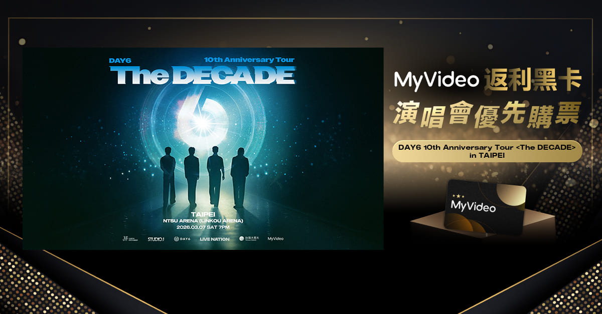 1.活動期間按下「立即參加」,即可獲得[DAY6 10th Anniversary Tour <The DECADE> in TAIPEI]專屬購票序號 (1組序號可購買2張票)。 2.購票序號適用於MyVideo會員獨享購票專區: 2026/1/16 11AM – 2026/1/19 11AM (需輸入由MyVideo提供之購票序號以進行購票),每組序號限購兩張,數量有限,售完為止。取得序號不代表購票成功。 3.專屬購票僅提供MyVideo用戶保留購買之服務,指定保留票價區塊皆開放限量張數,不保證座位排號一定優於其他開賣的部分。取得購票序號不等於保證購票或完成購票,售票進度依拓元售票系統為準,數量有限售完為止。 4.售票方式:於拓元售票系統採「實名制認證」,需持有效之節目票券以及個人附照證件正本,核對身份後入場,完整詳情請至拓元售票頁面。 5.相關演唱會購票流程及規範,請依照主辦單位Live Nation Taiwan理想國網站及拓元售票系統網站公告為準 6.1/15(四) 18:00前公布登記成功名單於MyVideo服務公告(https://www.myvideo.net.tw/info/announce),並同時以簡訊通知購買序號,如因拒收簡訊或無填寫聯絡電話,而無法取得購買序號,視為棄權,不再另外通知及補發。 7.本活動所有贈獎及抽獎活動皆與蘋果公司無關。