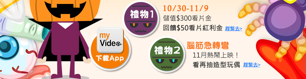 myVideo萬聖節活動 第一重  儲值看片金 紅利限時加碼 立即下載APP 腦筋急轉彎 迪士尼卡通Group 汽車總動員2: 世界大賽汽車總動員勇敢傳說 超人特攻隊 怪獸大學 海底總動員 下載APP 立即儲值看片金 立即觀看腦筋急轉彎 立即儲值看片金 立即觀看腦筋急轉彎 鐘樓怪人美女與野獸阿拉丁星際寶貝無敵破壞王 迪士尼動畫片廠短片精選 myVideo首頁 加入粉絲團 FB分享 迪士尼動畫片
