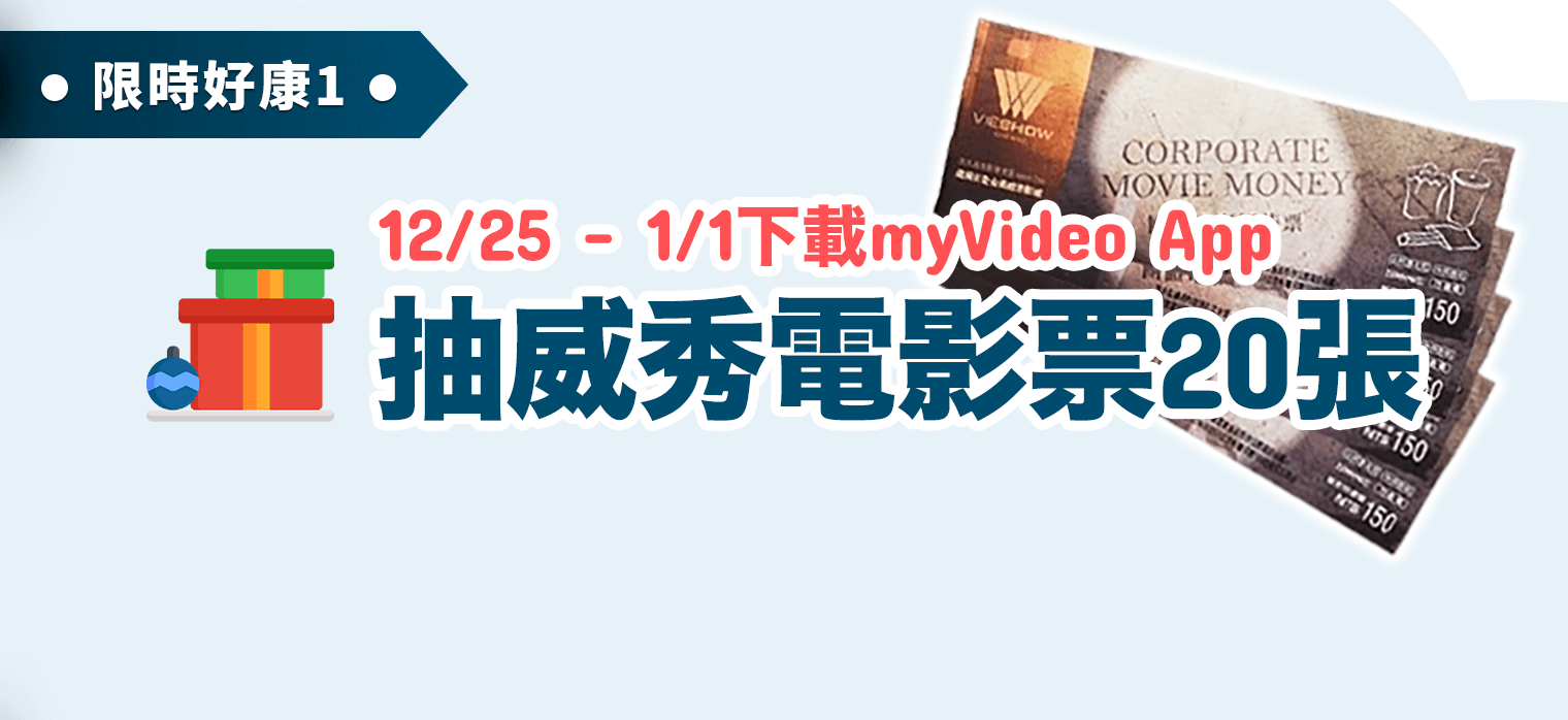 1. 活動期間:2017/12/25 - 2018/1/1止。 2. 下載App抽威秀電影票活動:活動期間下載myVideo App並完成註冊登入,就有機會抽中「威秀影城電影票」電子序號2組,獎項共10名。 3. 得獎通知:2018/1/15系統將發送站內通知與App推播,提供得獎用戶票券序號。 4. 贈品說明:請得獎用戶於序號有效期限前使用,序號逾期自動失效,恕不接受補發。 5. myVideo保留活動修改、終止與最後解釋權。