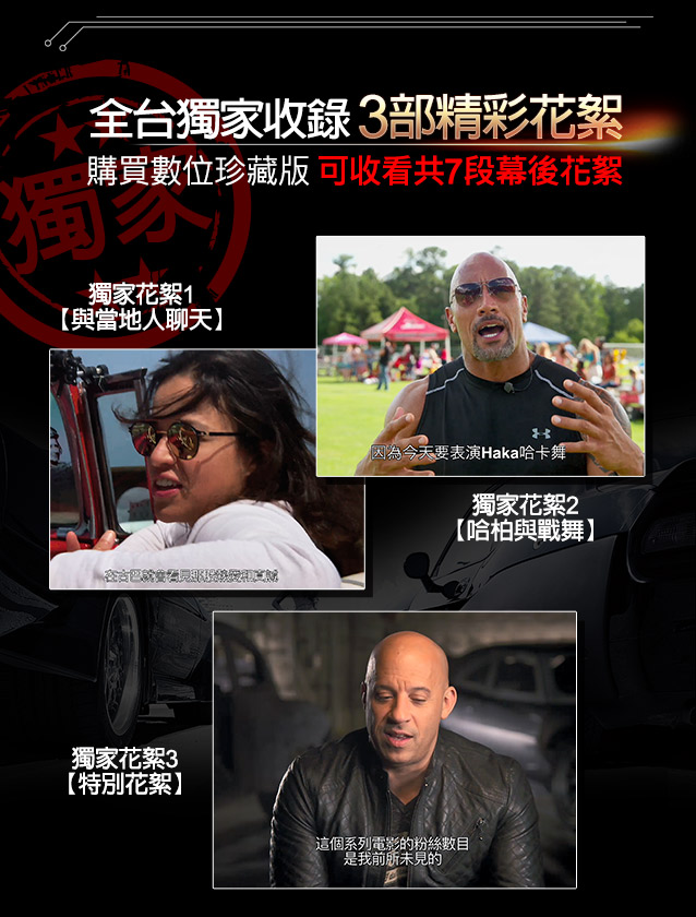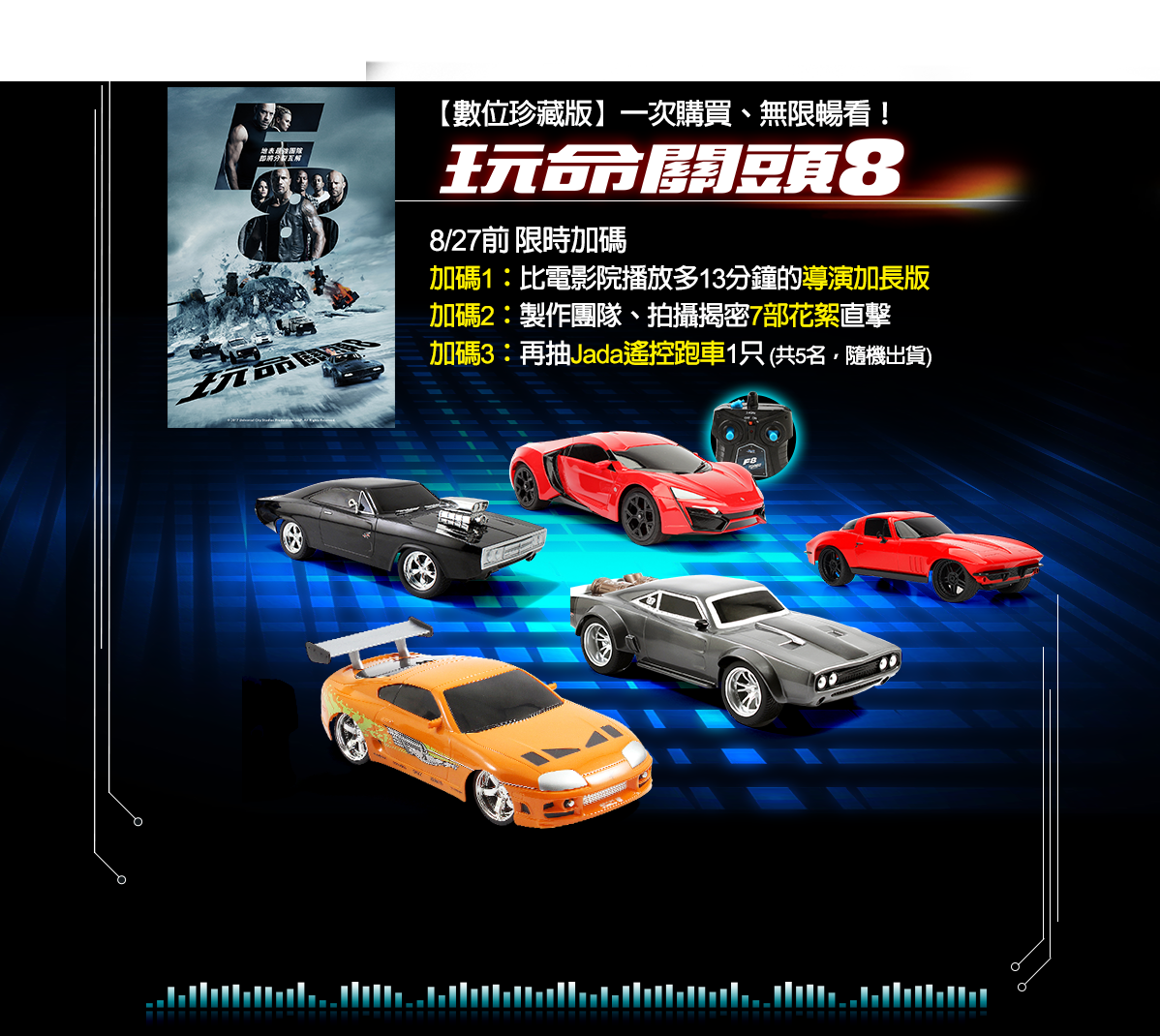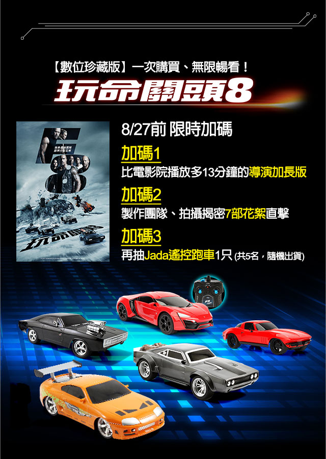 參加辦法:購買《玩命關頭8》數位珍藏版電影,即可抽Jada遙控跑車(共5名,隨機出貨)。