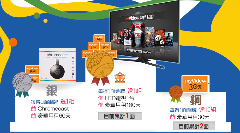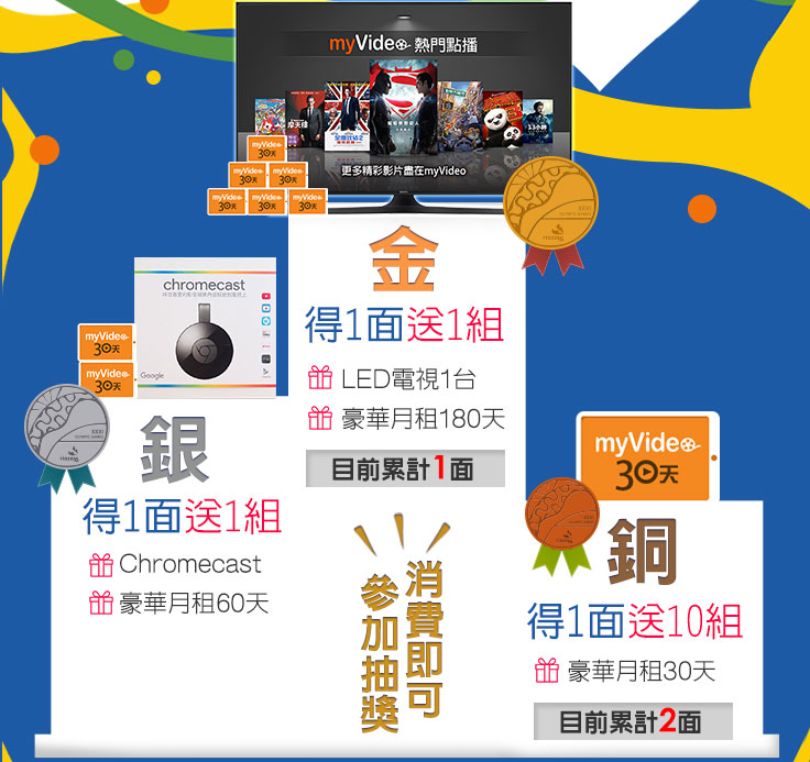 - 抽獎贈品之Samsung三星 43吋FHD LED液晶電視(UA43J5100AWXZW或同等級產品)與Google Chromecast得獎名單將於2016/9/1公布於myVideo官網服務公告 http://www.myvideo.net.tw/ 得獎者將由專人進行聯絡贈品寄送事宜,請確認帳號註冊資訊正確無誤。