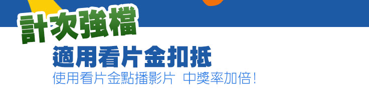 - 消費抽獎規則:每租借1部影片,即可獲得1次抽獎機會;每購買1部數位珍藏版或申辦無綁約月租服務,即可獲得3次抽獎機會;每申辦1件豪華月租綁約專案,即可獲得5次抽獎機會;儲值看片金不計抽獎機會,使用看片金租借或購買數位珍藏版可獲得雙倍抽獎機會(租借1部影片計2次抽獎機會,購買1部數位珍藏版計6次抽獎機會)。