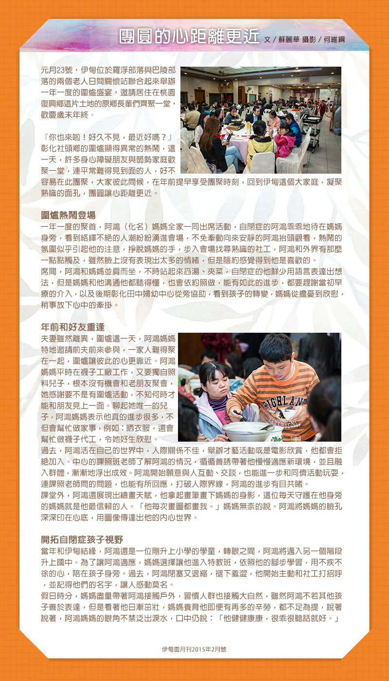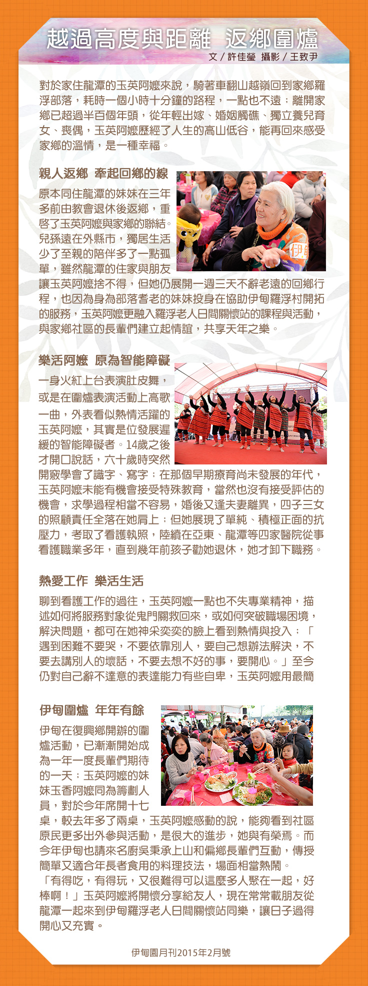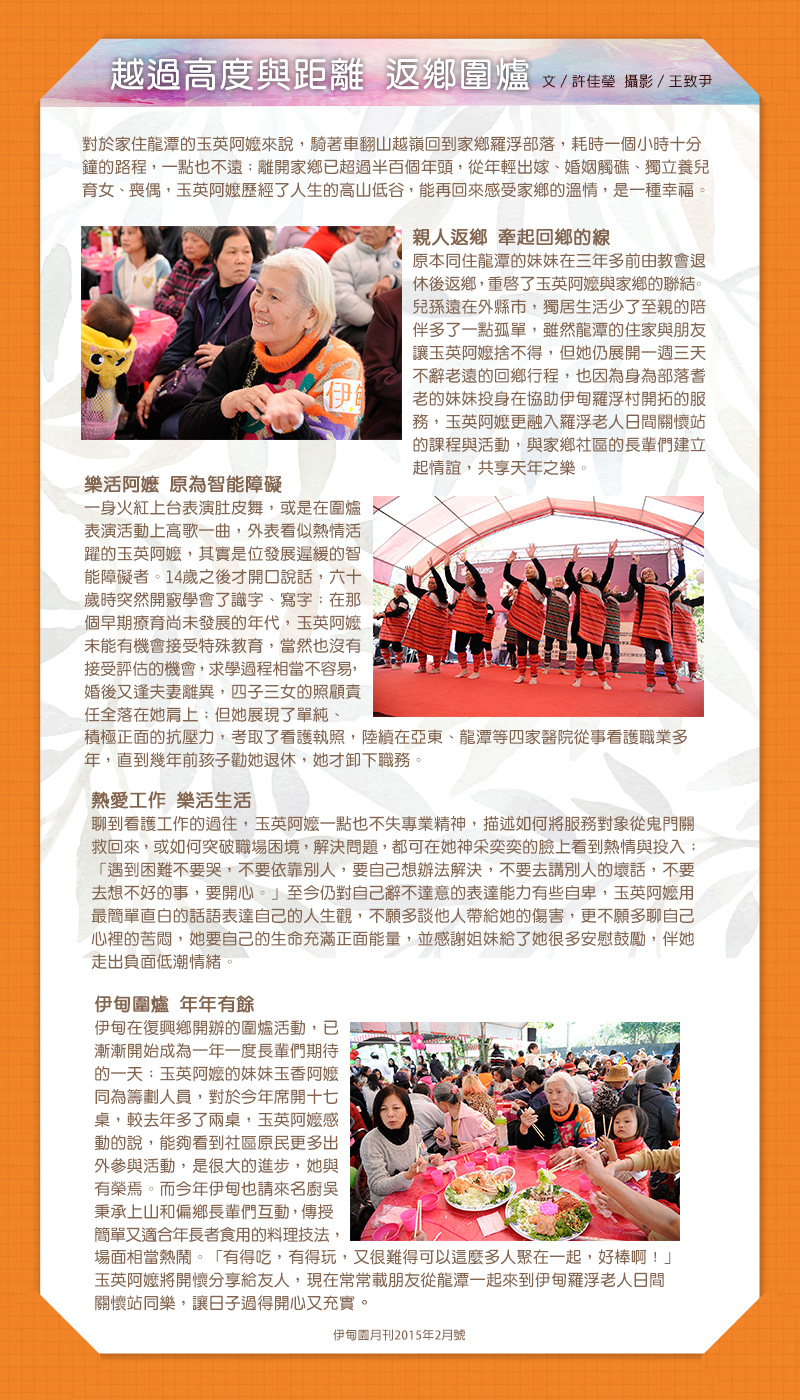 越過高度與距離返鄉圍爐【文/許佳瑩  攝影/王致尹】元月23號,伊甸位於羅浮部落與巴陵部落的兩個老人日間關懷站聯合起來舉辦一年一度的圍爐盛宴,邀請居住在桃園復興鄉這片土地的原鄉長輩們齊聚一堂,歡慶歲末年終。 團圓的心距離更近【文/蘇麗華 攝影/何維綱】一年一度的圍爐熱鬧展開,好久不見的朋友難得聚在一起,大家彼此寒暄相互道賀,情意濃厚,伊甸讓每個人的心都暖和了起來,也溫暖阿鴻媽媽的心。