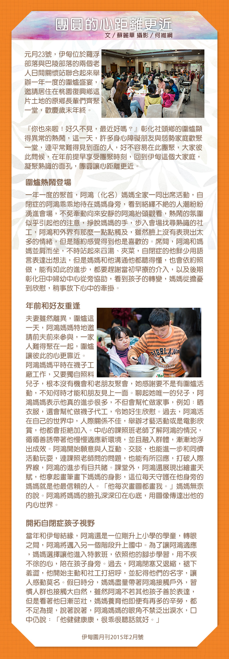 伊甸基金會2016.1月封面故事過年期間即將到來,大家都期待與好久不見的親戚相聚,共享圍爐夜;只是對於許多身心障礙朋友及失能家庭來說,往往因失去親人陪伴與經濟重擔,連吃頓簡單的團圓飯都變得困難。伊甸秉持著「哪裡有需要,就往哪裡去」的精神,將於今年一、二月至全台舉辦31場的圍爐活動,讓失能家庭在過年時分,也能有享用一頓熱騰騰的圍爐飯,不僅溫了身也暖了心。因此,伊甸基金會邀請您發揮每一份小小卻堅定的力量,支持「愛‧圍爐」,融化冷冽的寒冬,使失能家庭有個溫馨的新年,讓愛無限延續。