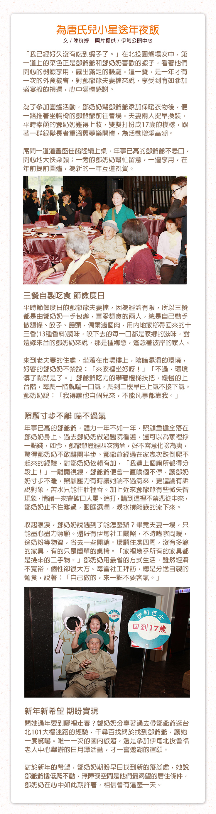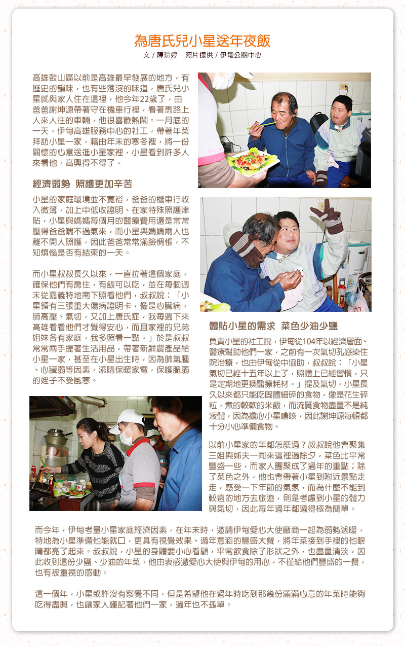 豐盛年菜,一年才有的感動【文‧圖 / 蘇麗華   部分圖片提供 / 伊甸公關中心】闔家團圓,享用豐盛年菜對弱勢家庭來說多麼不易!鄧爺爺夫妻檔省吃儉用,只有在圍爐活動上難得有機會品嚐到豐盛菜色,這一天的第一道菜色蝦子讓他們大快朵頤,直說這個食材不曾買過。看到滿滿的蝦殼,就知道他們有多麼開心了。 為唐氏兒小星送年夜飯【文/ 陳玠婷    照片提供 / 伊甸公關中心】領有三張重大傷病證明卡的唐氏兒小星,家中經濟並不富裕,但是他有愛他的家人,都在盡其所能地照顧他。今年,伊甸基金會想為小星的新年添菜,傳遞希望與溫暖給他,看到豐盛菜色的小星,眼睛都亮了起來。支持「愛‧圍爐」服務計畫