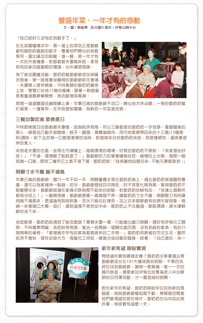 豐盛年菜,一年才有的感動【文‧圖 / 蘇麗華   部分圖片提供 / 伊甸公關中心】闔家團圓,享用豐盛年菜對弱勢家庭來說多麼不易!鄧爺爺夫妻檔省吃儉用,只有在圍爐活動上難得有機會品嚐到豐盛菜色,這一天的第一道菜色蝦子讓他們大快朵頤,直說這個食材不曾買過。看到滿滿的蝦殼,就知道他們有多麼開心了。