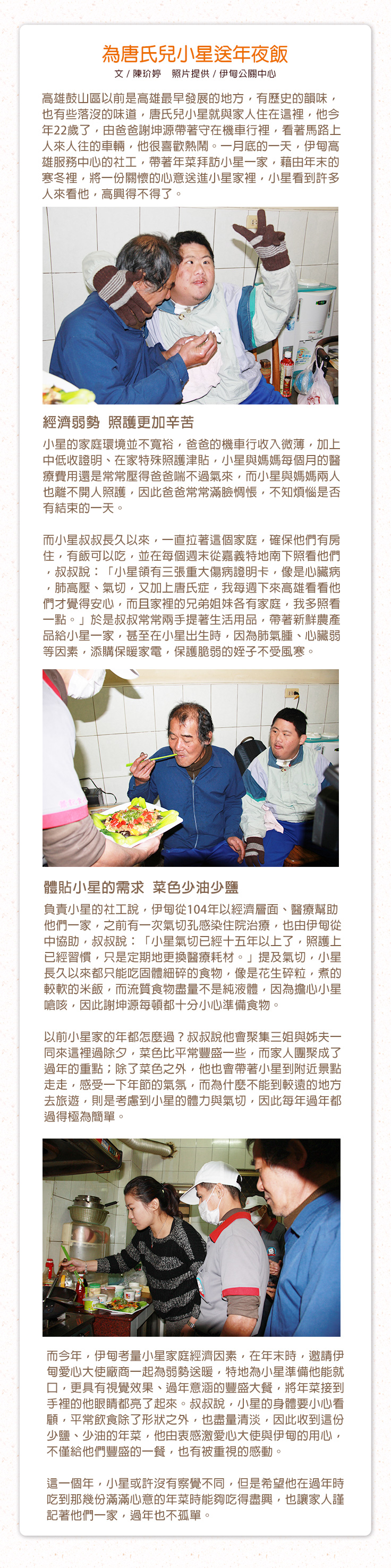為唐氏兒小星送年夜飯【文/ 陳玠婷    照片提供 / 伊甸公關中心】領有三張重大傷病證明卡的唐氏兒小星,家中經濟並不富裕,但是他有愛他的家人,都在盡其所能地照顧他。今年,伊甸基金會想為小星的新年添菜,傳遞希望與溫暖給他,看到豐盛菜色的小星,眼睛都亮了起來。支持「愛‧圍爐」服務計畫