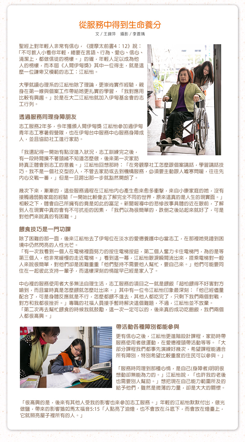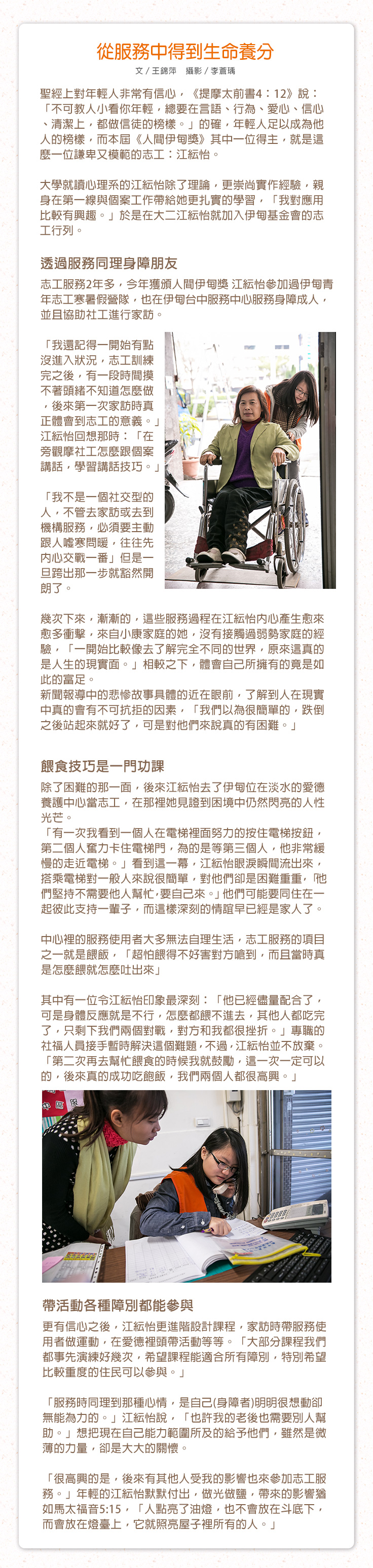 「我們相愛,不要只在言語和舌頭上,總要在行為和誠實上。」年輕的江紜怡用身體力行服務身心障礙朋友,從中體會服務的意義,成為她生命的養分。