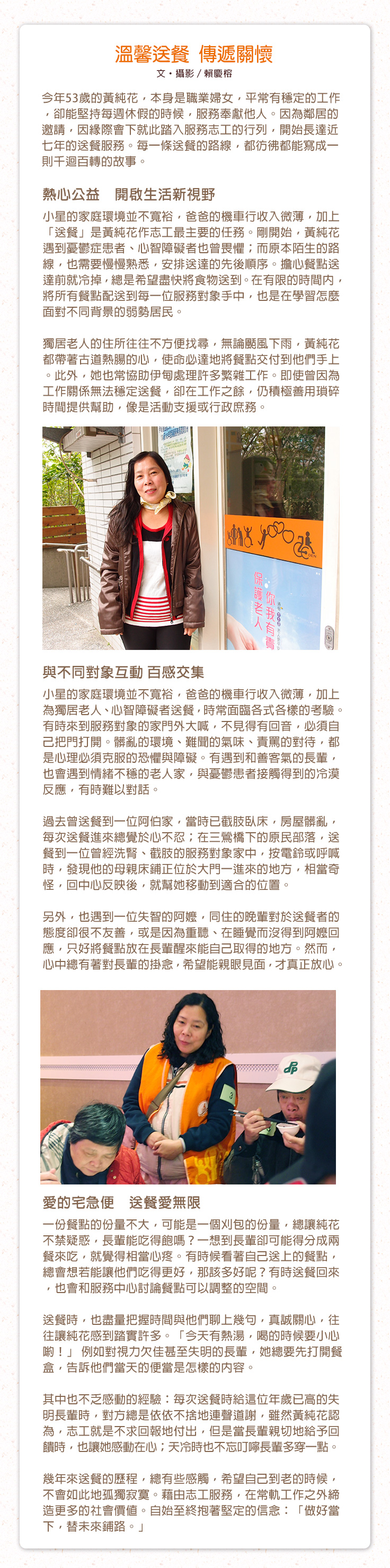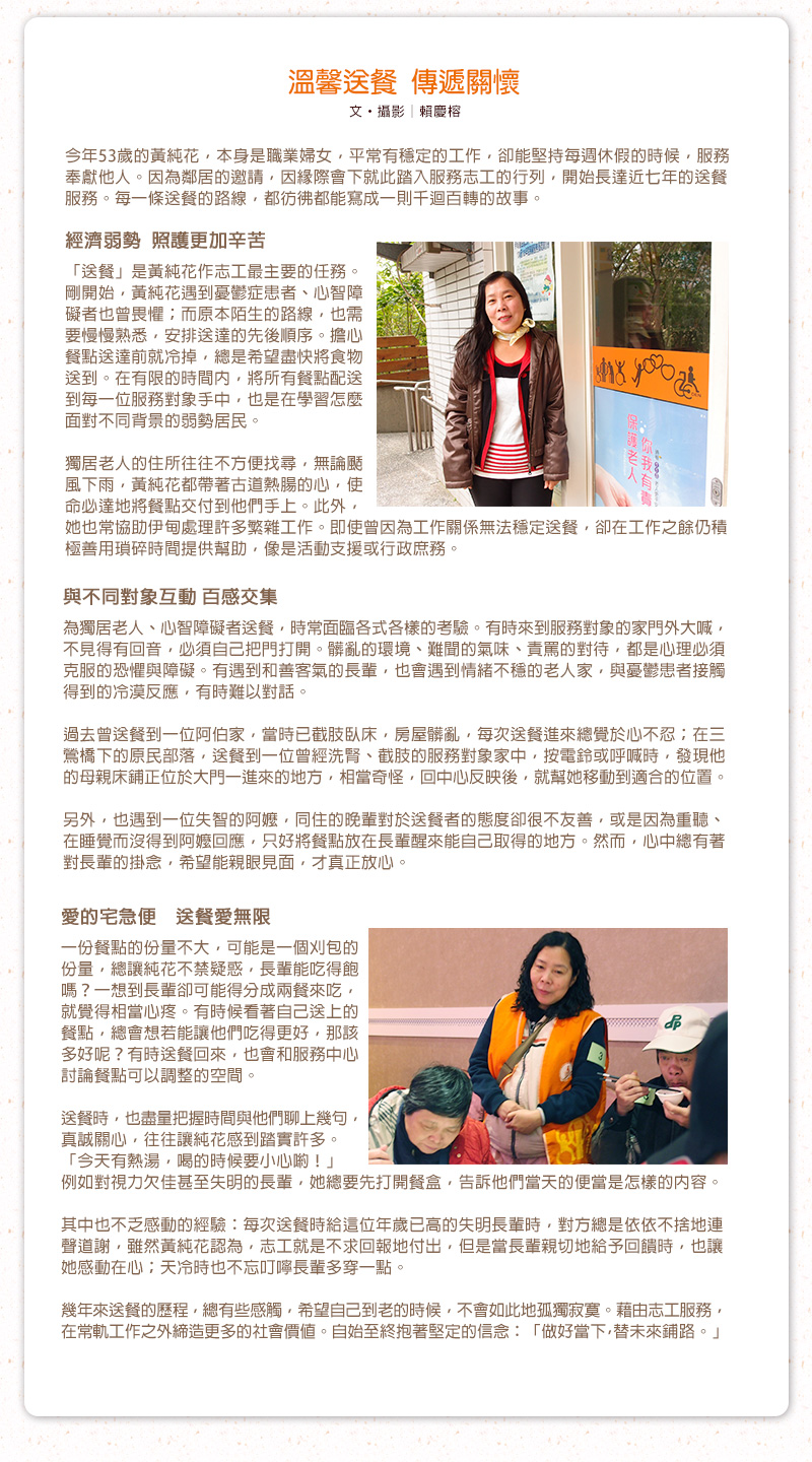 「我們相愛,不要只在言語和舌頭上,總要在行為和誠實上。」年輕的江紜怡用身體力行服務身心障礙朋友,從中體會服務的意義,成為她生命的養分。 溫馨送餐 傳遞關懷「哈囉阿嬤!今天好嗎?我幫您送便當來啦!」騎著機車穿梭於三峽大街小巷的黃純花,將愛心餐點送到每個需要的弱勢居民手上。投身於伊甸志工,一晃眼已七年,願意持續在工作以外的時間,堅持著服務他人的志業,相當難能可貴。
