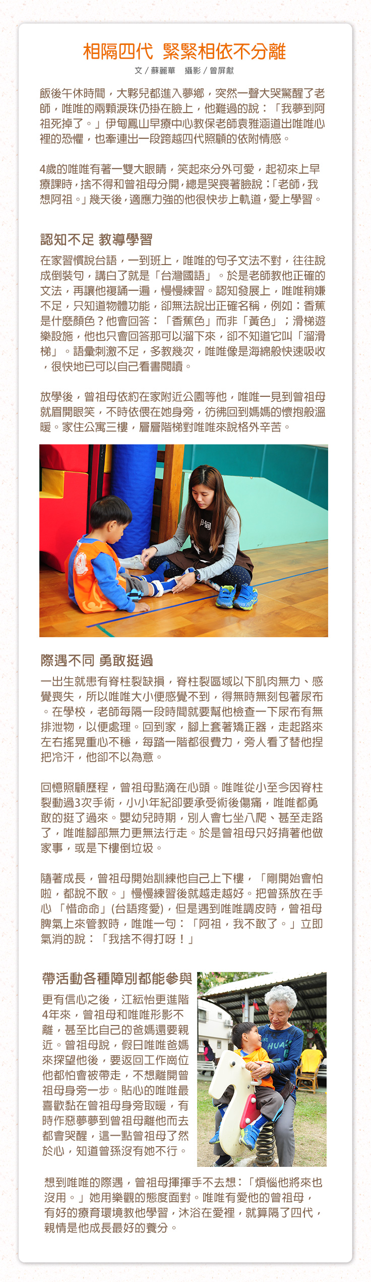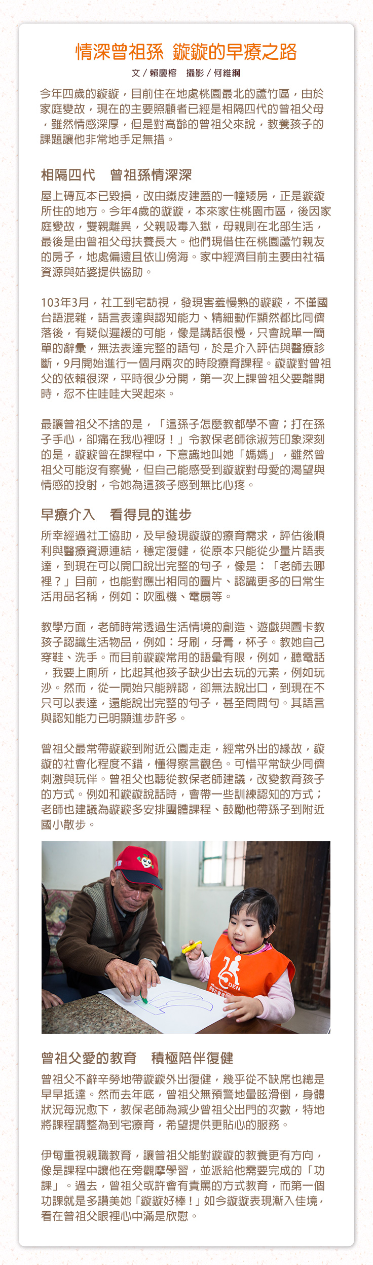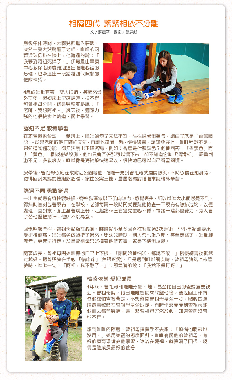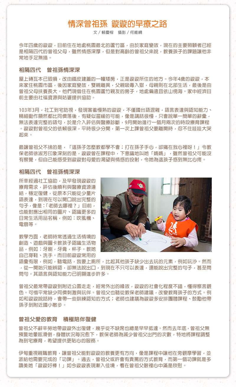 相隔四代 緊緊相依不分離 早療兒唯唯從小由曾祖母照顧,兩人感情濃得化不開,唯唯知道84歲的曾祖母年事已高,深怕有離開他的一天,他壓抑著情緒,用行動證明他有多愛曾祖母。 情深曾祖孫 鏇鏇的早療之路 「看這邊,有哪些是圓形的東西呢?」教保老師耐心地引導小女童鏇鏇,指出視線可見的圓形物品,「時…鐘…」眨著大而圓潤的雙眼,鏇鏇怯生生地唸出聲。同時,鏇鏇的曾祖父也陪同著,盡可能參與每一次課程。