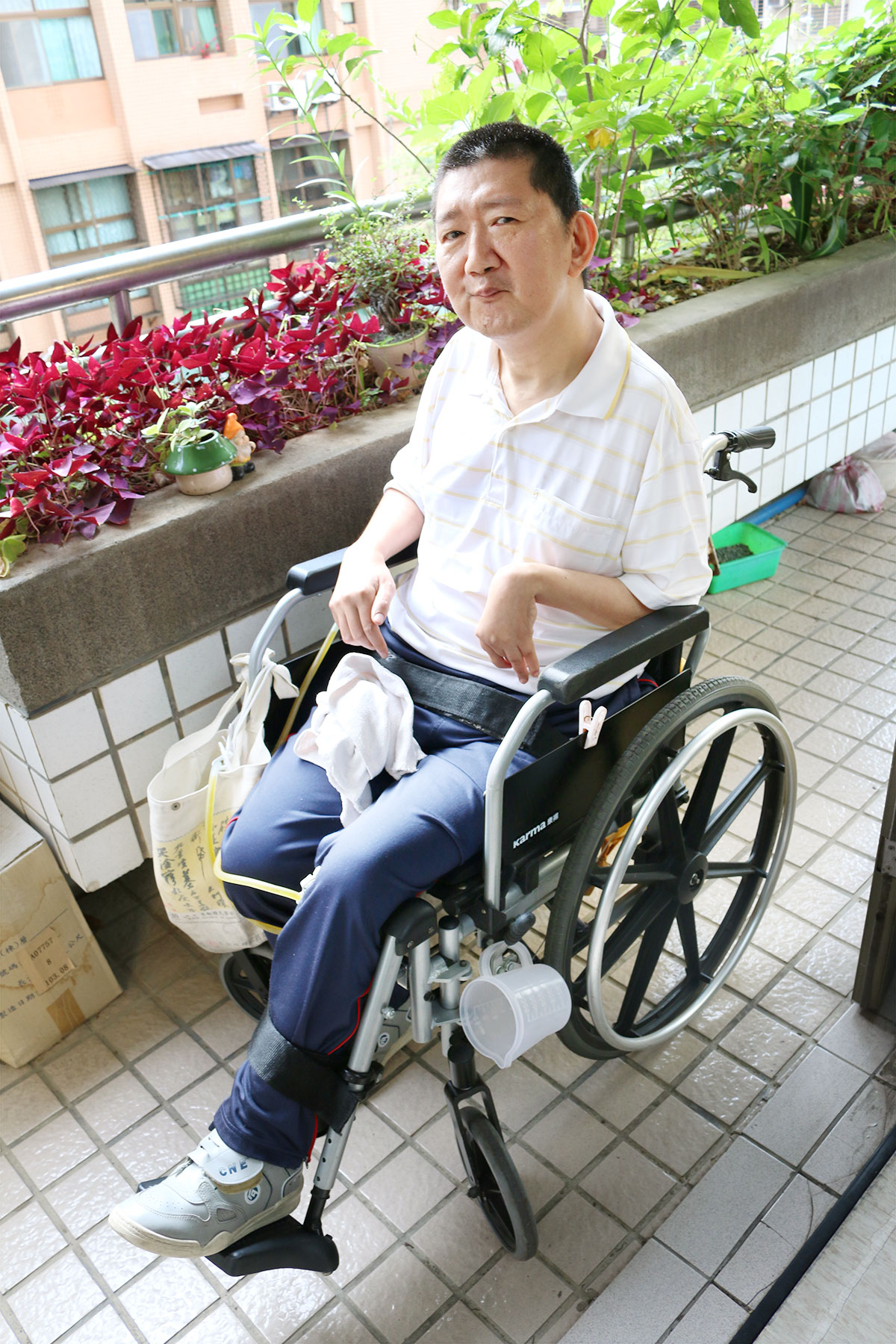 不良於行的阮聖予,三歲前只能以竹籃代替輔具,白天就坐在竹籃裡出來曬太陽,門前的院子是他活動的天地。一天,他跟爸媽說他想站起來!於是父母一人扶著他一隻腳,陪他練習走路。爾後雙腿裝上支架行走,阮聖予覺得自己雄赳赳、氣昂昂有如眷村站崗的衛兵般神氣。 |