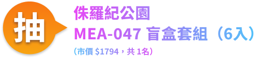 - 2025年6月27日至2025年7月27日至台灣大哥大三創門市與活動打卡牆合照並上傳至指定貼文,即可抽:侏儸紀公園 MEA-047 盲盒套組(6入),市價$1794,共1名。