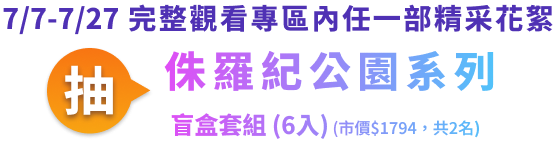 - 2025年7月7日至2025年7月27日完整觀看侏羅紀專區內任一部精采花絮,即可抽:侏儸紀公園 MEA-047 盲盒套組(6入),市價$1794,共2名。