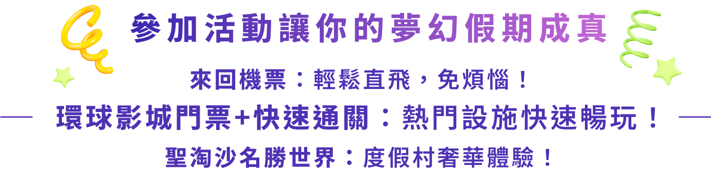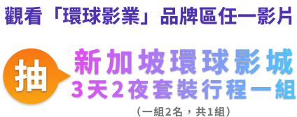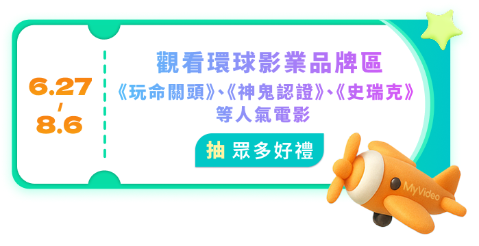 - 抽獎資格:活動期間MyVideo豪華月租之用戶,於MyVideo環球影業品牌區內完整觀看任一電影,即可享一次抽獎資格,抽「新加坡環球影城3天2夜雙人機票+住宿之旅」的機會(一組2名,共1組,每組價值約新台幣8萬元)。完整觀看係指觀看該影片之時數累積達到90%以上片長時數,依MyVideo系統紀錄為準。